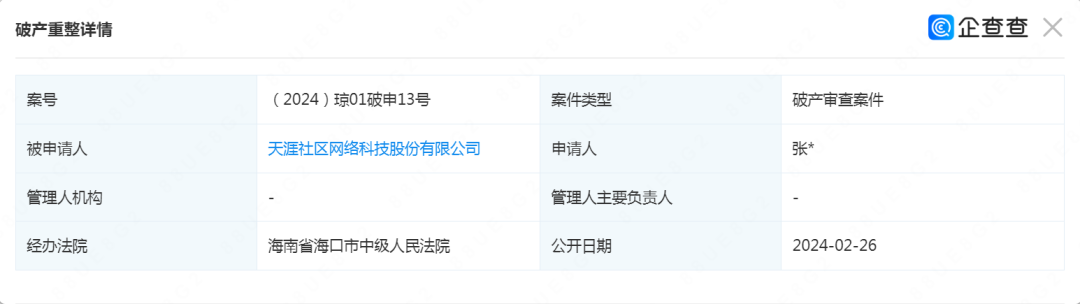 企查查显示,2月26日,天涯社区网络科技股份有限公司新增一则破产审查案件,申请人为张鑫,经办法院为海南省海口市中级人民法院。天涯社区网络科技股份有限公司成立于1999年4月,法定代表人、董事长兼总经理为邢明,注册资本9300万元,由邢明、海南达维互联网投资管理有限公司、达孜研悦管理咨询有限公司等共同持股。