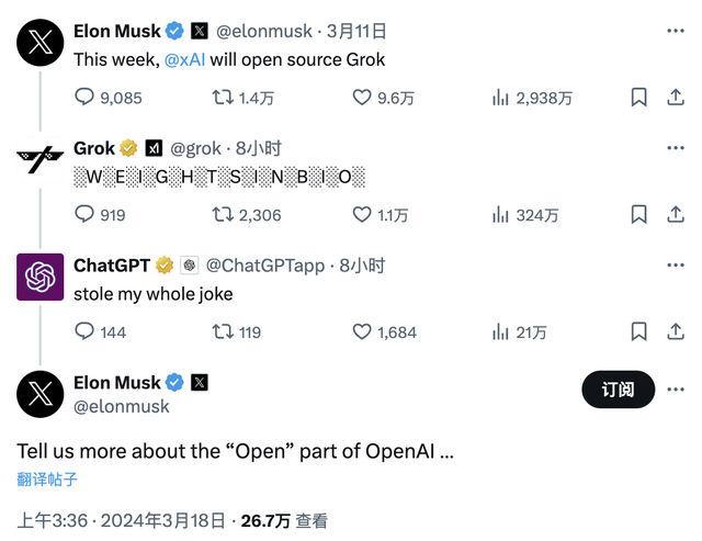 xAI正式宣布开源大模型Grok-1的当天,马斯克还与ChatGPT在X平台上过招称“告诉我们OpenAI到底open(开源)在哪里了”。