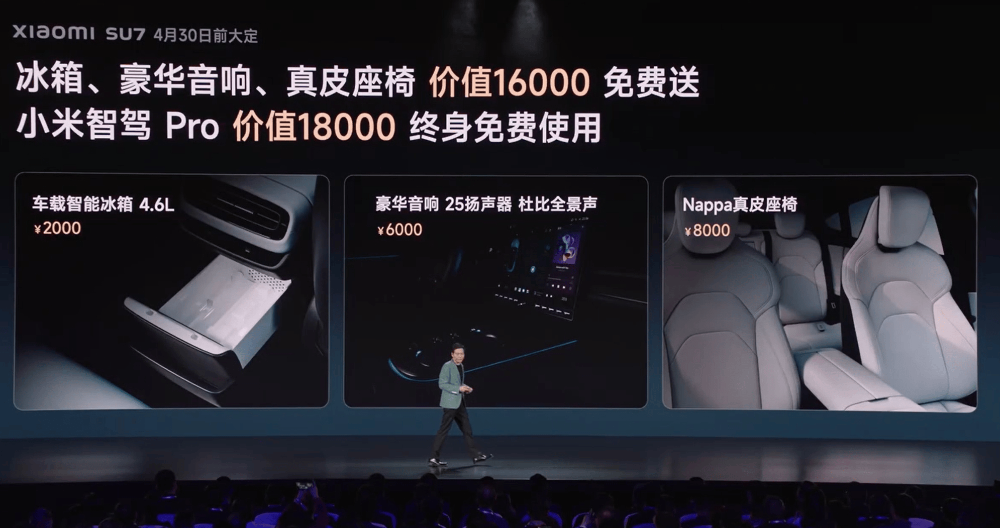 雷军表示,小米SU7系列将于3月28日22:00开始支付定金,4月30日之前大定免费赠送车载智能冰箱、豪华音响、真皮座椅。小米智驾Pro终身免费使用。