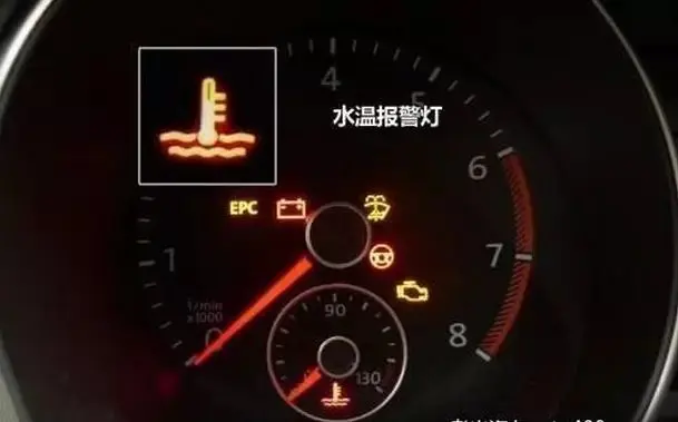 水温指示灯用以显示车辆发动机内冷却液的温度。一些没有水温表的车型(如长城小型车系列)会以指示灯的颜色显示冷却液温度情况:蓝色代表水温过低,熄灭代表水温正常,红色则代表水温过高。发动机最怕的就是缺油、缺水,水温报警灯点亮和机油报警危险系数相当,如果温度过高继续行驶会导致发动机高温,致使缸体变形,车主可以自行添加冷却液或纯净水应急。若出现“粘缸”、“呲缸垫”,请立即联系拖车救援。