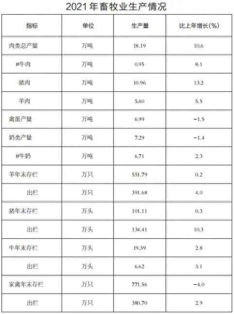 2021年农林牧渔业总产值512.83亿元,比上年增长5.9%。其中,种植业产值322.49亿元,增长2.6%;畜牧业产值158.43亿元,增长11.7%;林业产值8.49亿元,增长17.0%;渔业产值2.38亿元,下降0.2%;农林牧渔服务业产值21.05亿元,增长4.6%。