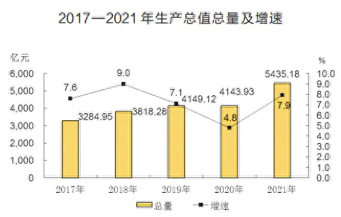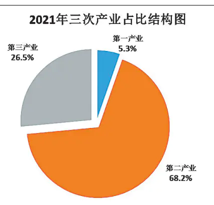 根据地区生产总值统一核算结果,2021年实现生产总值5435.18亿元,比上年增长7.9%。其中,第一产业增加值290.25亿元,增长5.6%;第二产业增加值3704.64亿元,增长7.6%;第三产业增加值1440.29亿元,增长9.2%。一二三产业增加值占生产总值的比重分别为5.3%、68.2%和26.5%。按常住人口计算,人均生产总值149899元,约合23511美元。