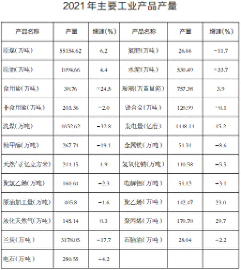 全市规模以上能源工业企业产值比上年增长61.4%,非能源工业产值增长34.3%,能源工业与非能源工业产值占全市规上工业产值的比重分别为82.6%、17.4%。能源工业中,煤炭开采和洗选业产值增长81.5%;石油天然气开采业增长29.5%;石油和煤炭加工业增长43.7%;电力热力生产供应业增长20.2%。非能源工业中,化学原料制品制造业增长54.3%;有色金属冶炼业增长34.2%。