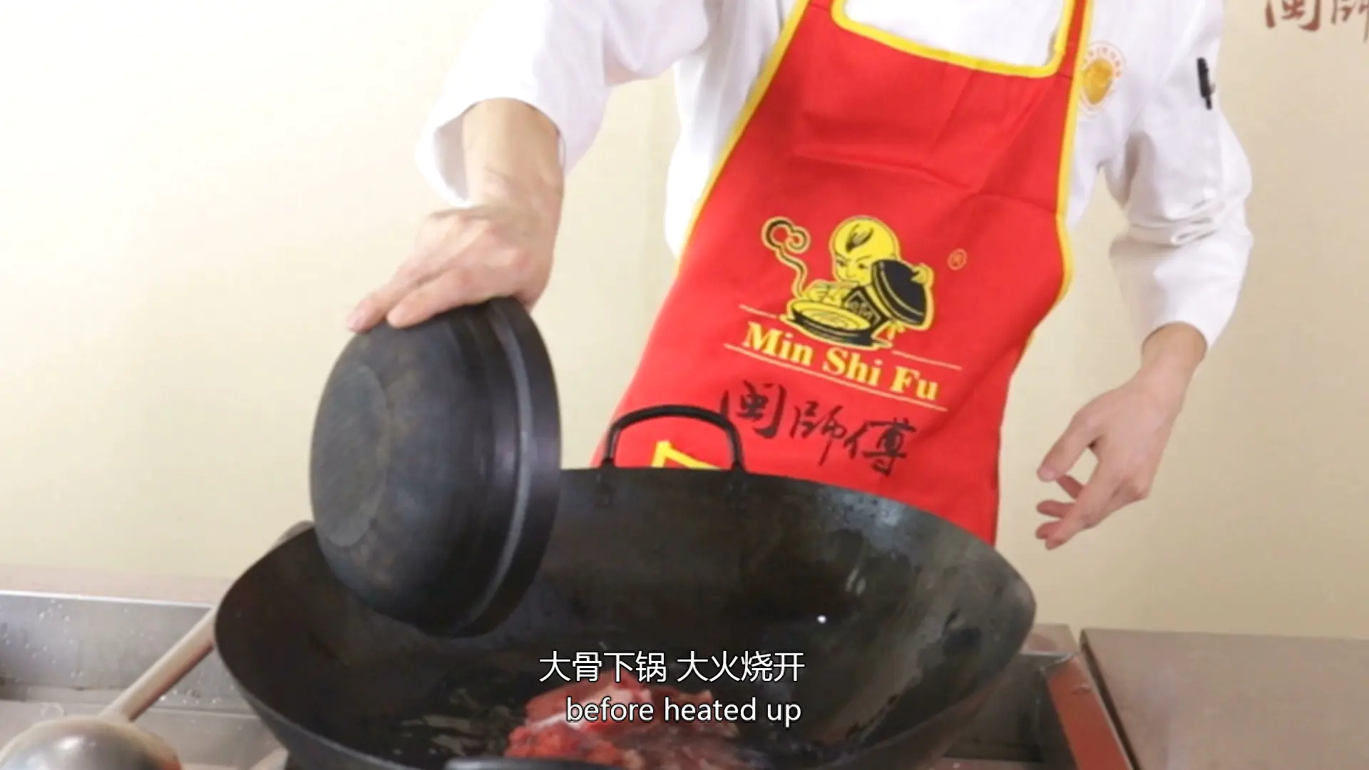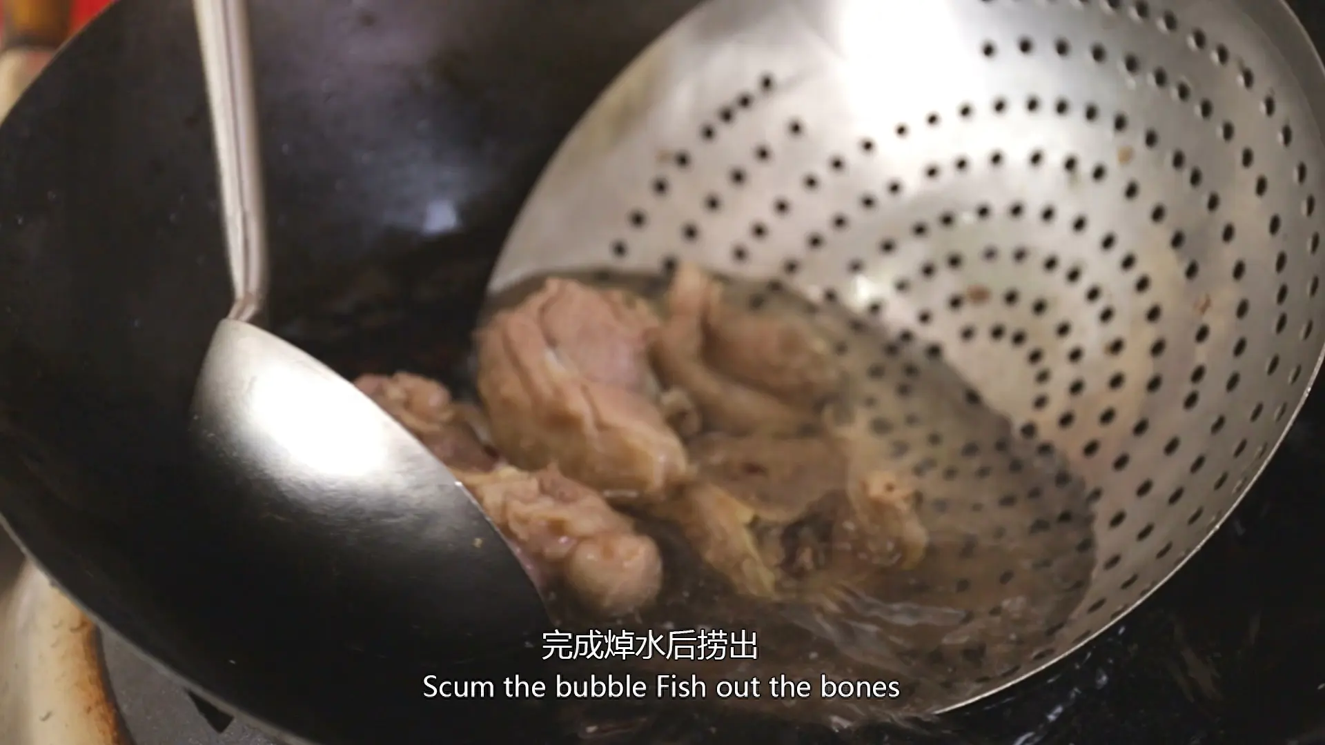2,净锅,冷水。大骨下锅,大火烧开,撇去浮沫,完成焯水后捞出,清洗干净,与2500克水一起下高压锅压十分钟。