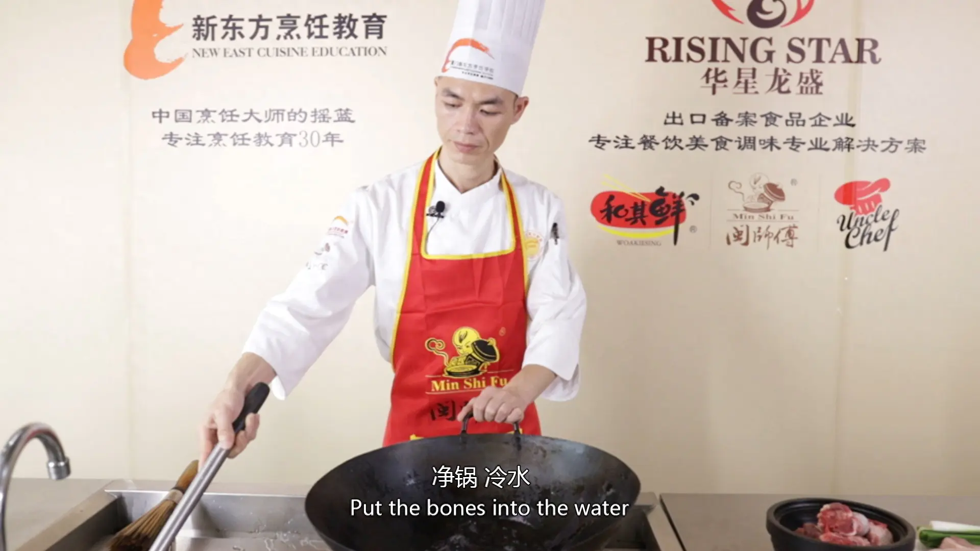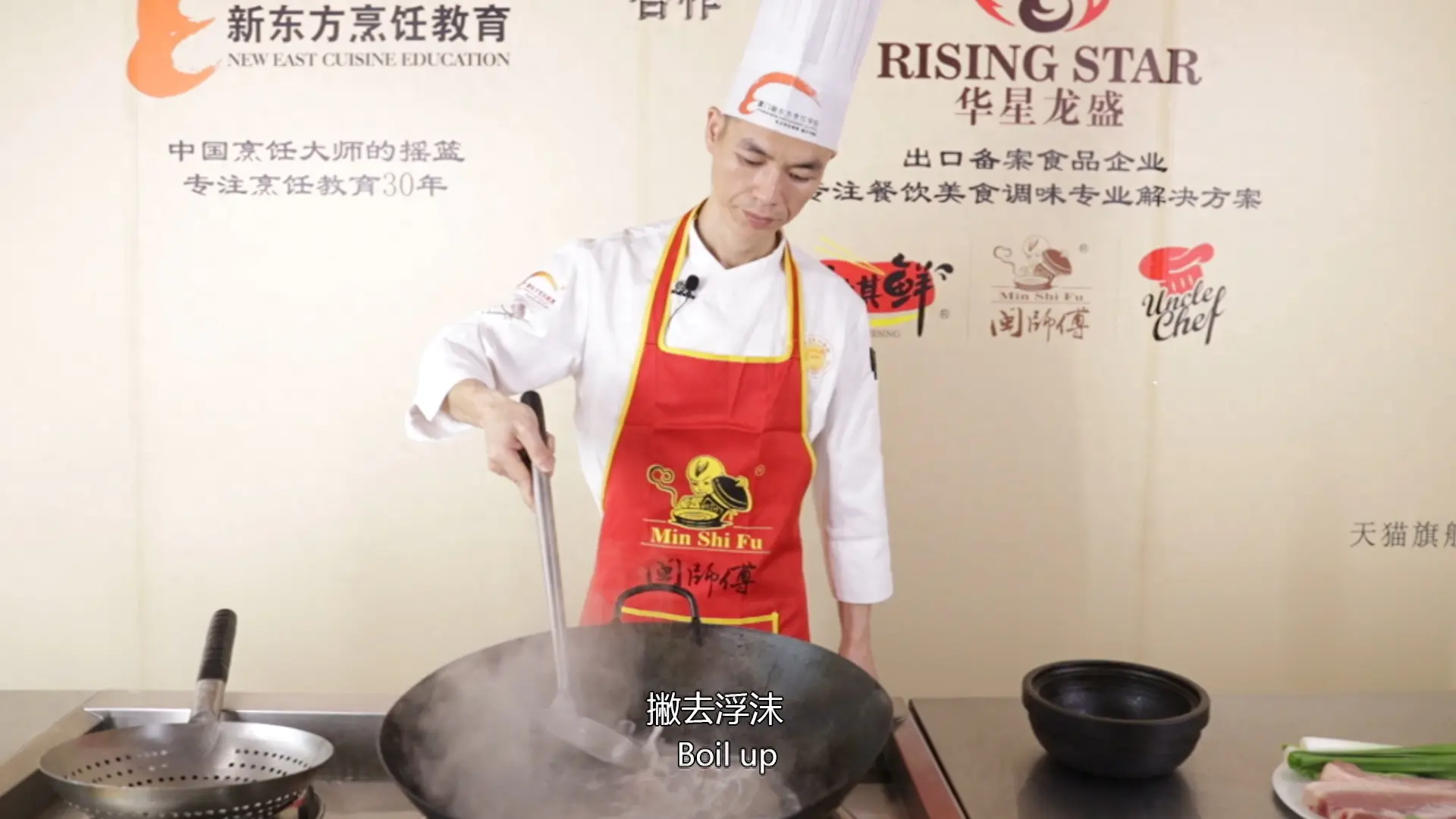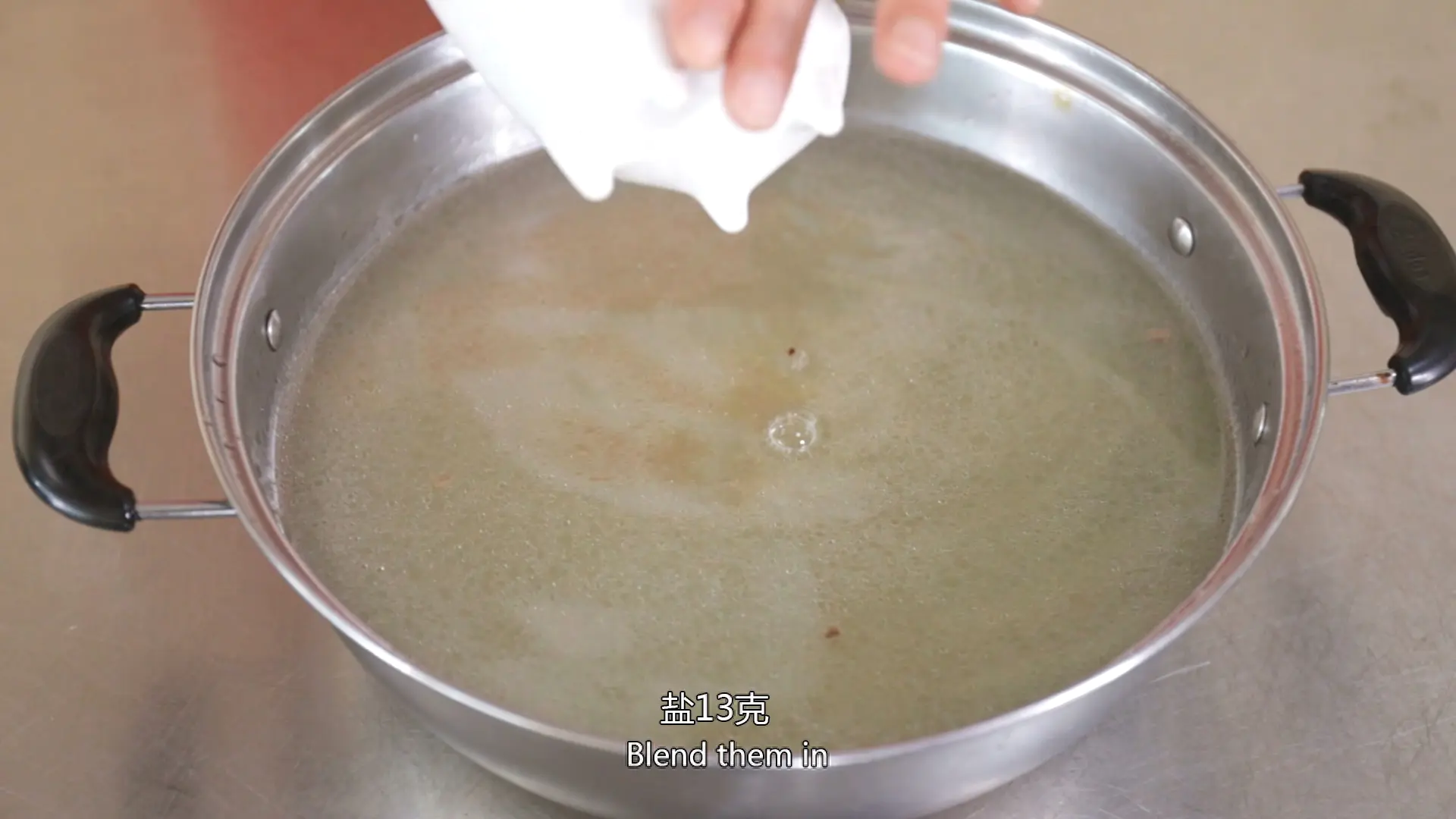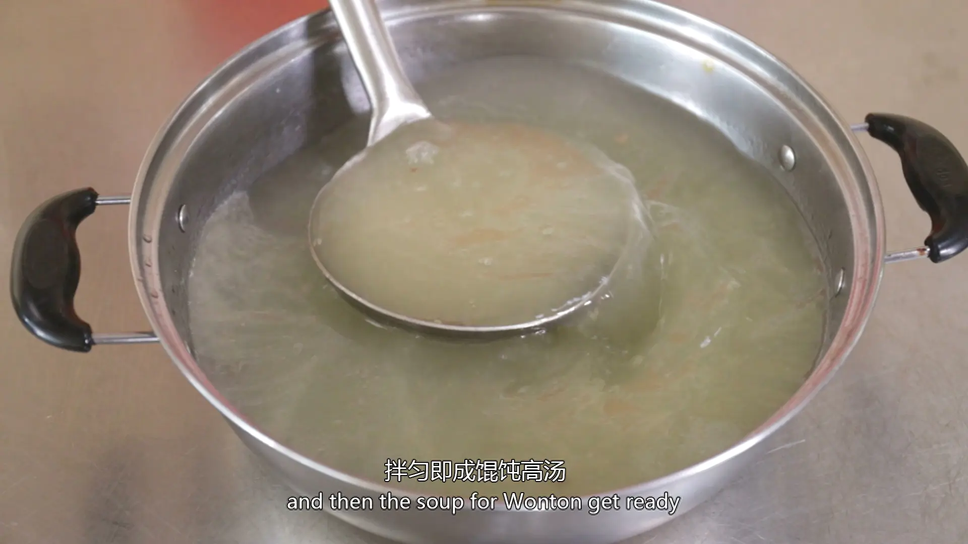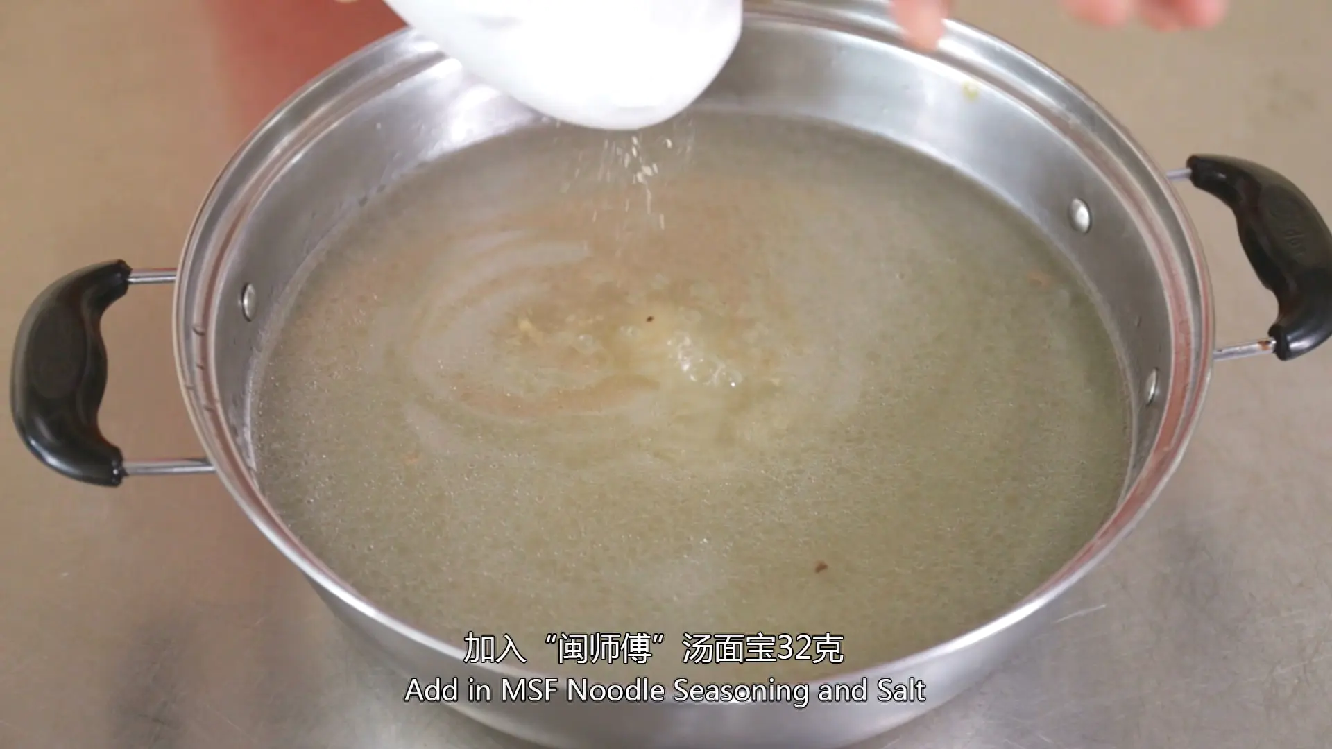 3,过滤出汤水,加入“闽师傅”汤面宝32克,盐13克,拌匀即成馄饨高汤。