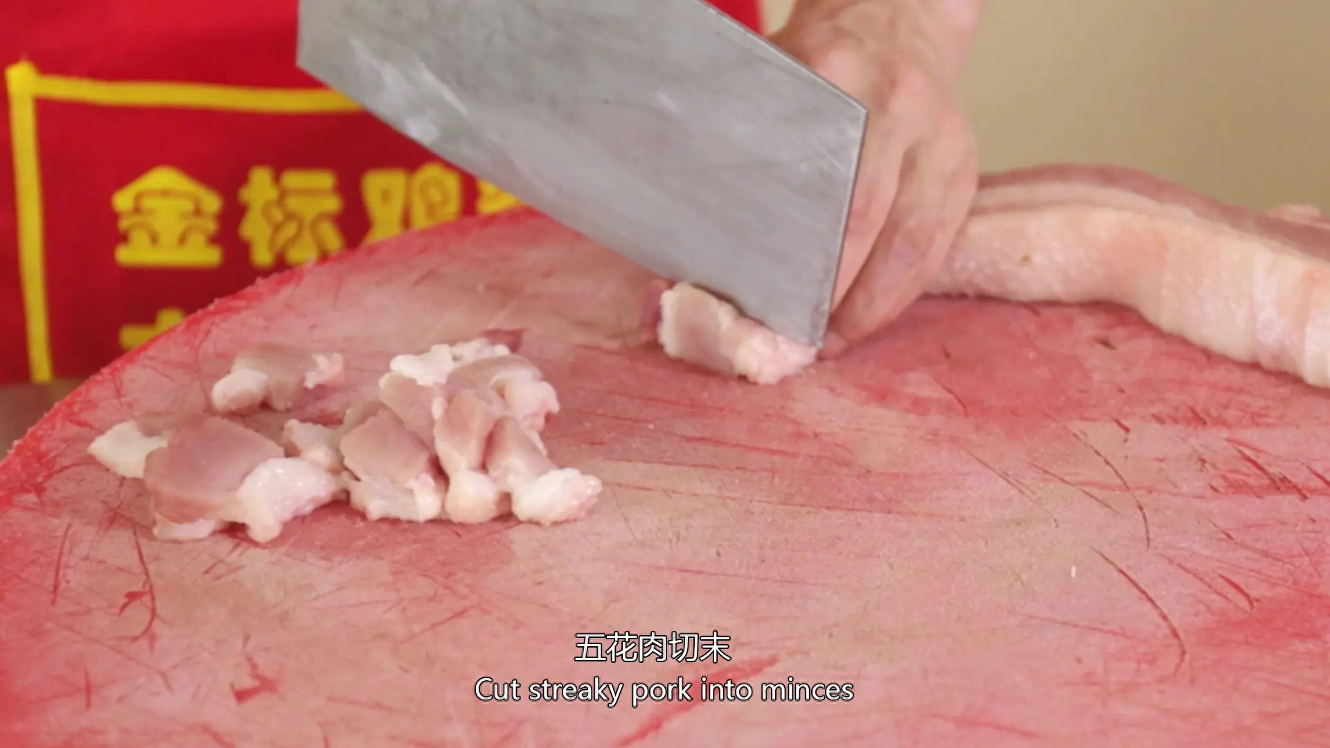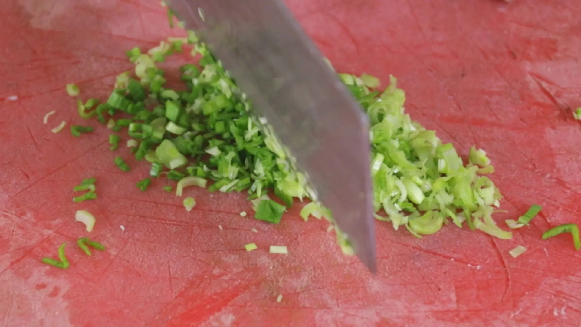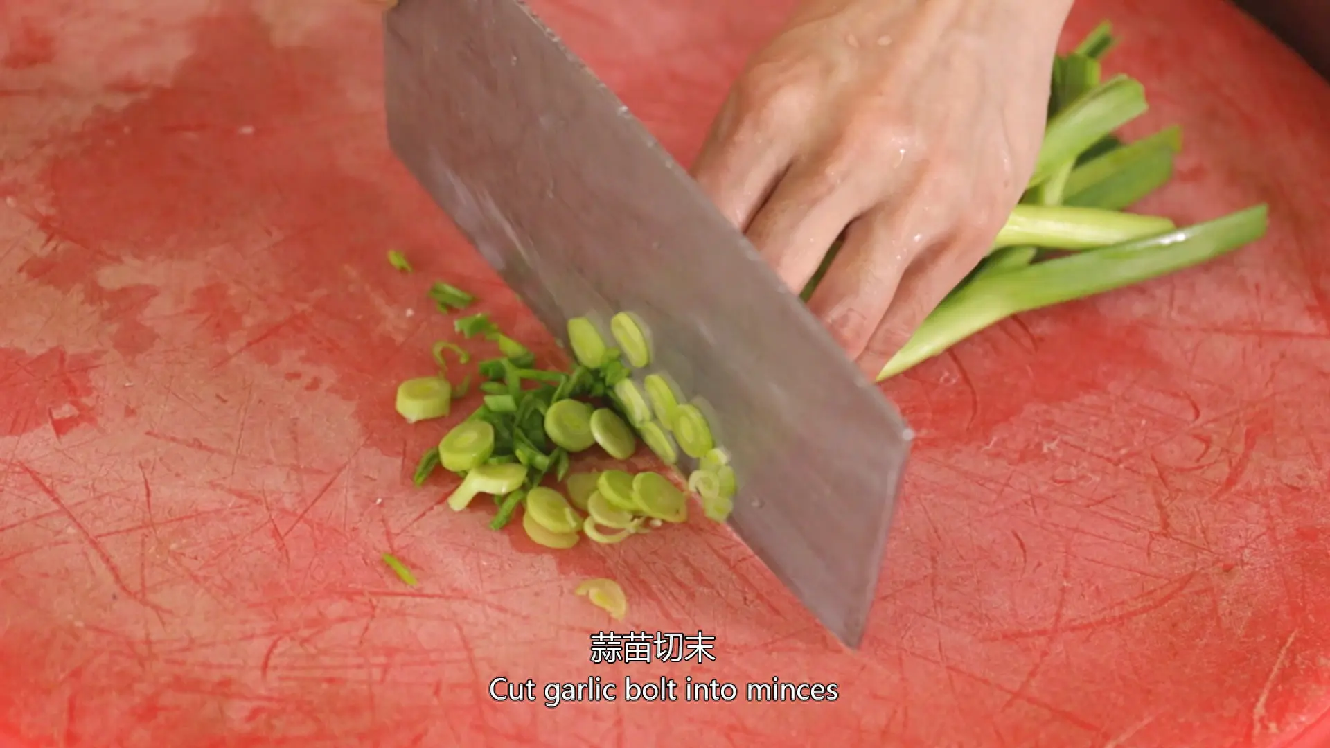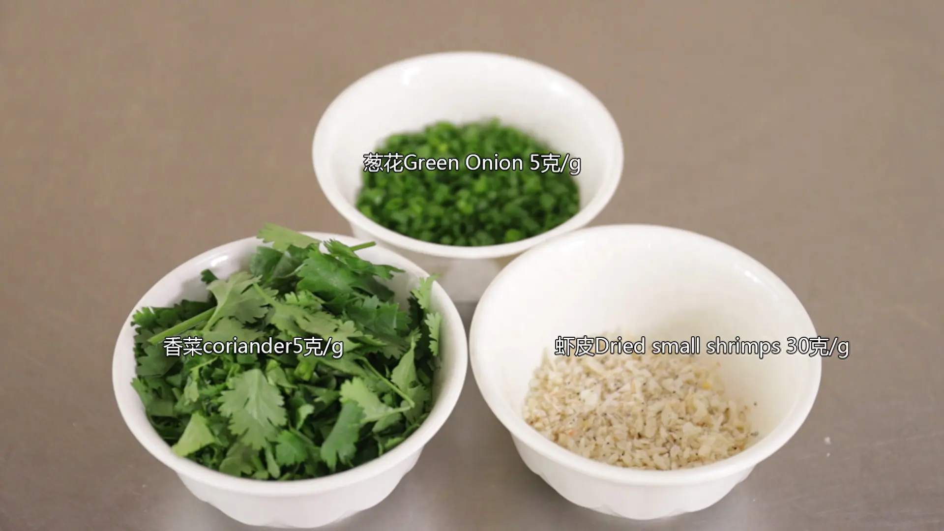 5,下入蒜苗末70克、虾皮末30克、姜末20克拌匀。