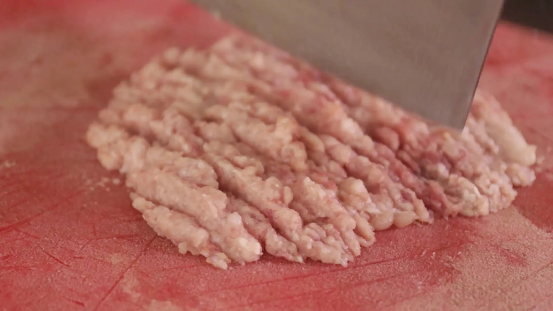 4,“闽师傅”调馅料15克、水200克、味极鲜10克、老抽8克,一起拌匀,分三次倒入五花肉末中,搅打上劲。
