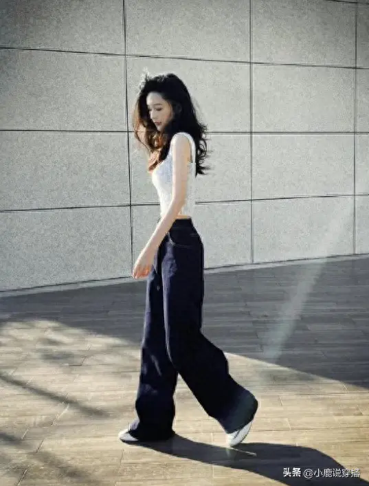 穿搭小知识:白色针织吊带背心 蓝色阔腿裤 小白鞋 长发披肩
