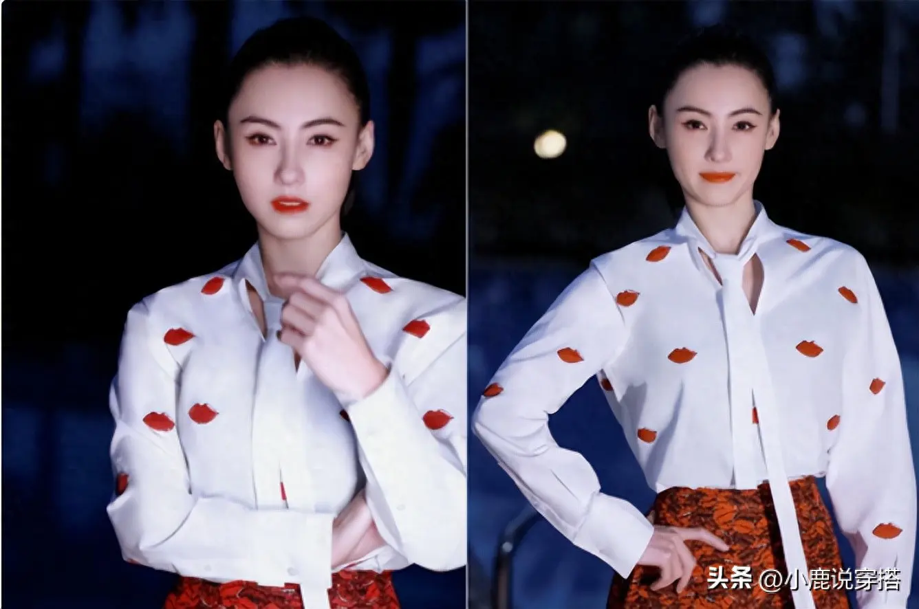 首先,我们来看一下张柏芝的搭配方式,她选择了一件高领镂空唇印上衣作为主打。镂空设计让前胸的肌肤一次性展露出来红色搭配什么颜色比较高级,对于本身肤色就具有美感的张柏芝来说,这确实是一件好事。因为她属于冷白皮肤类型红色搭配什么颜色比较高级,将肌肤展示出来反而让她看起来更加性感。加上白色上衣带有唇印图案,提升了服装的质感,使服装层次更加明显。