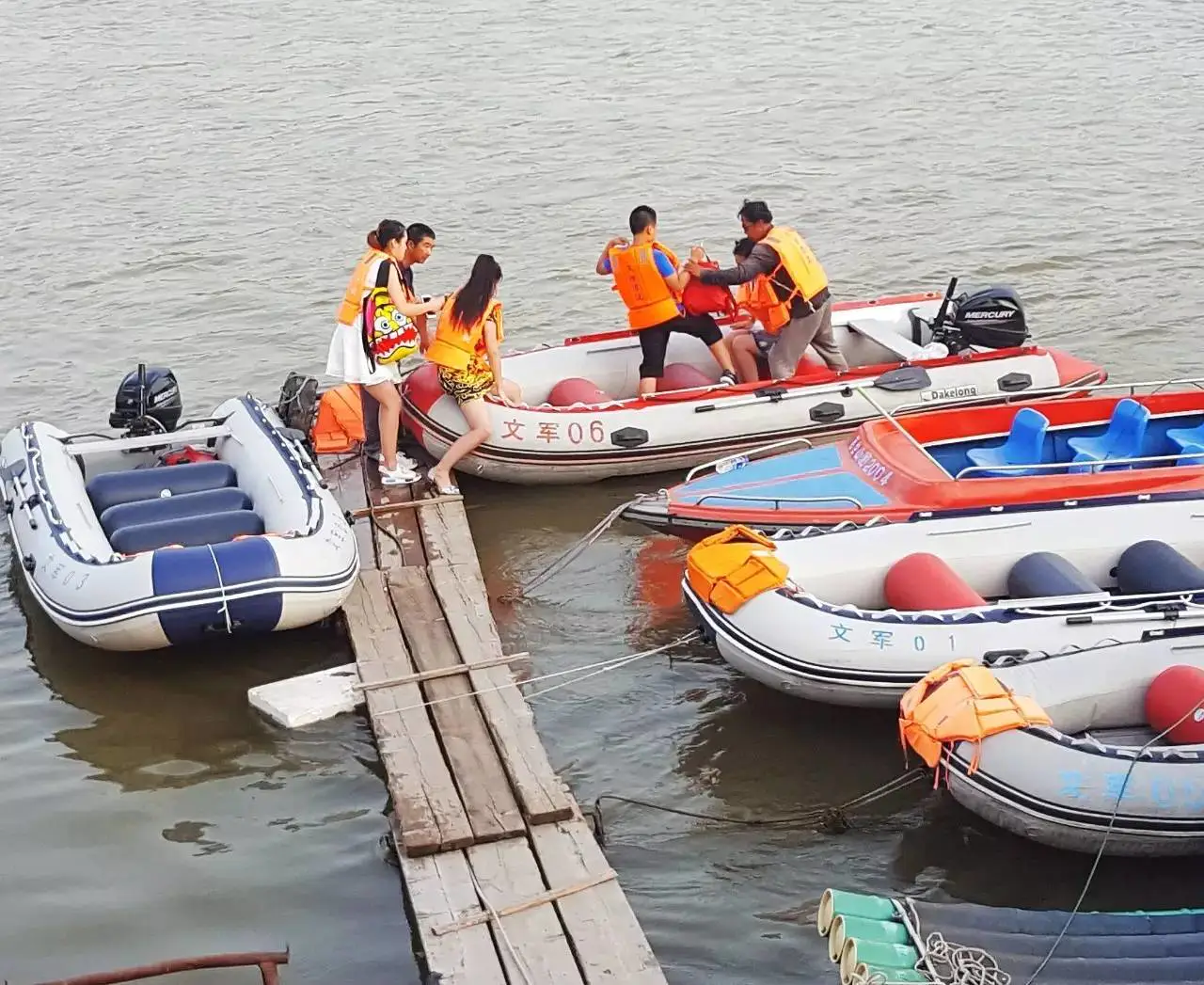 记者注意到,玩水上游乐项目的游客很多,有不少老人和儿童。一些待客的快艇、竹排和漂流圈沿着江边排列,长约200米的江段形成了码头。购票后坐快艇、竹排或者选择漂流项目的游客,要通过一条简易的踏板进入。正如游客王先生所担心的那样,这些简易的踏板两侧并没有安装防护栏或者扶手,部分踏板是用木板拼接起来的,已经老化变形。另外,江水打湿后特别湿滑水上游乐项目,在快艇、竹排出发或返回的过程中,踏板上并没有安全员帮扶。在水上游乐的现场,也没有设立任何安全警示标志。