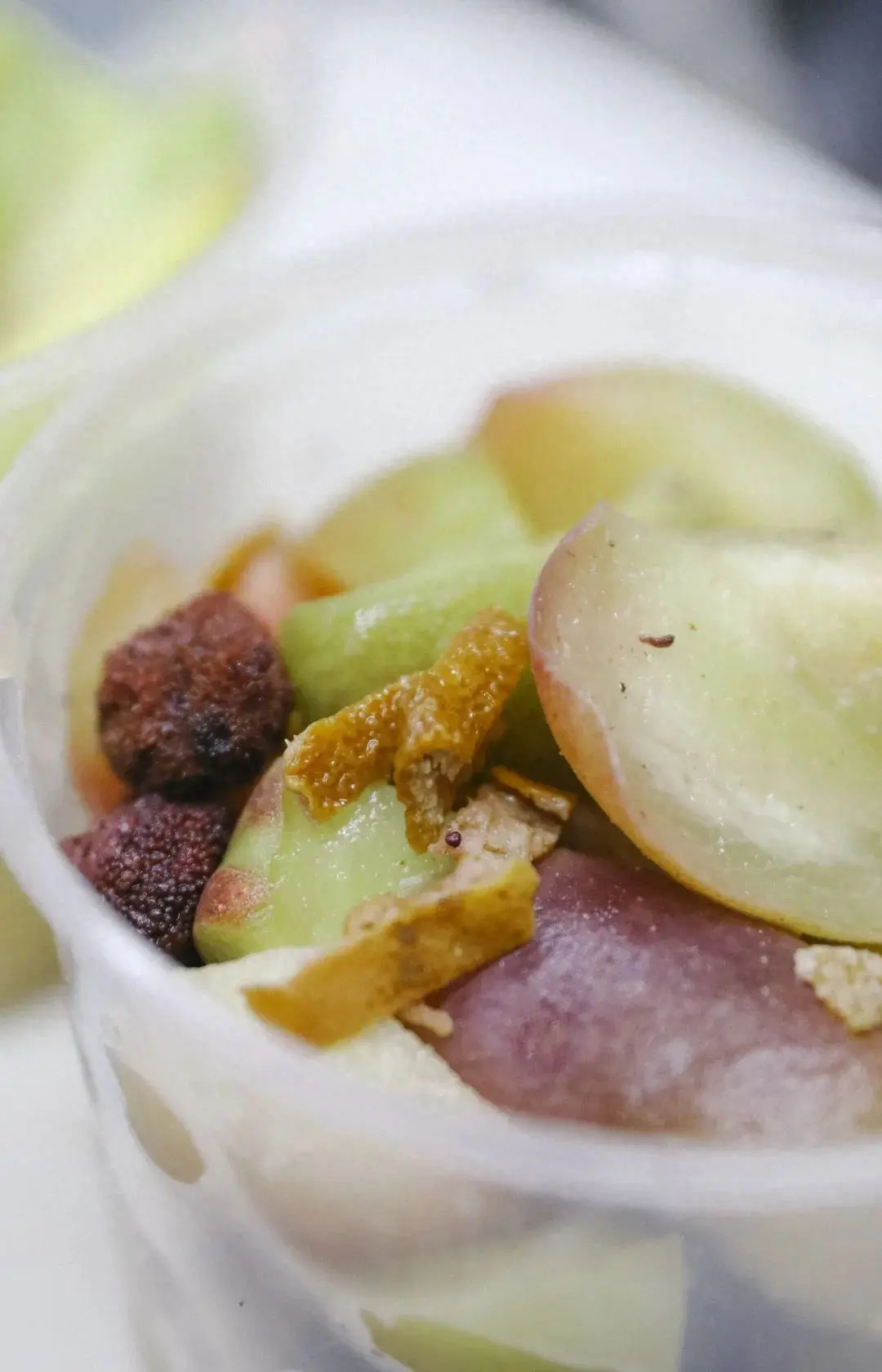 说起怎么卖起的腌水果,团结回忆道:以前在店里呆着,嘴也闲,便学着长辈的方法,加些陈皮、酸梅腌些水果自己吃。