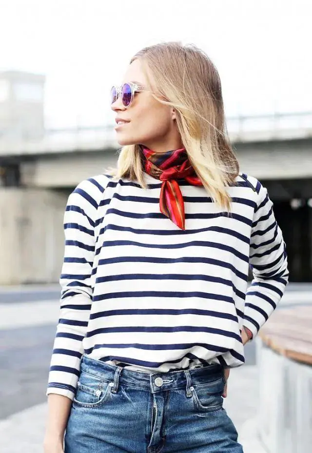 原来看似规整的海魂衫也能那么潮!除了搭配对国人意义非凡的红色领巾外,搭配黑丝巾也是常见搭配,显得人物形象愈发内敛干练,连Kate Moss也爱这样穿,All in Black的窄丝巾、西服夹克、腰带、紧身裤、皮靴却碰撞大圆领海魂衫,又优雅又痞酷!