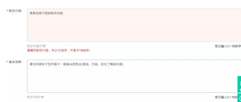应用简介最少为50个字符,没有其他具体的要求,各位根据自己家实际的需要进行填写,版本说明这个也是根据实际需要填写,只要不少于5个字就好。