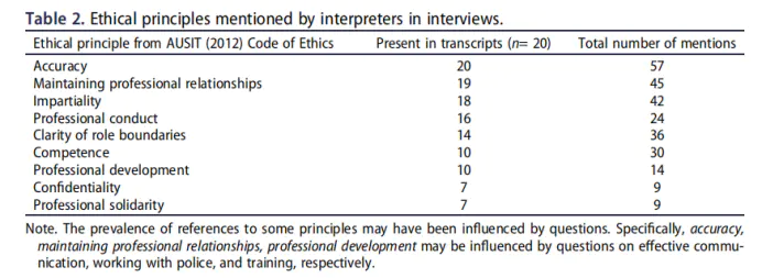 这里作者引用了一位受访者的代表性经历。这位受访者曾经因为个人道德准则与职业道德守则之间的冲突非常苦恼。她表示,自己在参与警方对嫌疑人的讯问工作时常常会因为警方的一些严苛而不公平的指控感到痛苦。这位译员同样来自移民家庭,因此总是能够与嫌疑人产生共鸣,而嫌疑人也往往将这位译员视作自己的帮助者。出于自己的个人情感和嫌疑人的期待,这位译员有时会在嫌疑人本身并无请求的情况下介入案件,代表嫌疑人对警方和辩护律师提出意见(例如指出讯问的不公平)。而这种行为实际上违反了“公正客观”及“明晰角色界限”的原则。