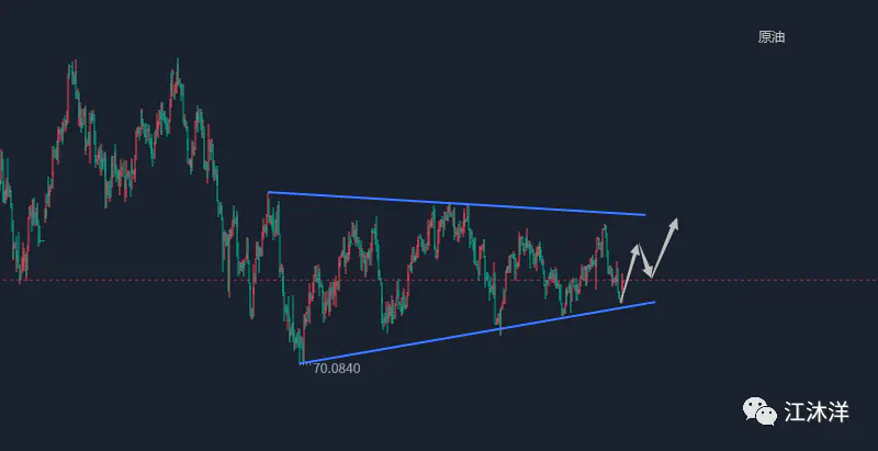 技术面,原油周线级别收实体中阴且上下都留有影线,整体上K线在中轨下方承压横向整理有一段时日了,中轨不被企稳基本上多头很难得到延续,下周关注K线的转换以及能否上破中轨。日线昨日收探底阳线,结束了前面的K线连阳,短线上原油由弱转强,整体上日线近期处于一个高点逐渐下移,低点逐渐抬升的三角收缩形态,昨天价格在触及下沿线止跌反弹,因此下周操作思路是以不破本周五低点继续向上看国内黄金价格走势,4小时级别布林带收口,原油价格在74.7附近止跌反弹,形态上收出启明之星,这是见底信号,副图指标MACD初步形成金叉,红色动能柱初现,指标显示原油价格开始转强并有继续上攻的动能,因此下周一原油短线操作江沐洋建议保持做多思路为主,短线下方关注76.1-75.6附近支撑,上方关注77.8一线阻力。