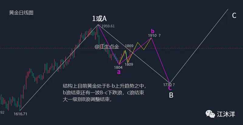 前面我们曾给大家推演过黄金的波浪级别,视黄金1616上涨1959为1浪或A,我们暂时看作A浪,1959为向下B浪起点,通过目前行情的运行,B浪内部细分为三波下上下结构,随着本周行情在1809止跌反弹且上涨破了新高,可以确定B-a浪调整结束,当下行情所处的位置为B浪b,因此,接下来的走势就比较清晰,操作上就是主多,本周我们也多次在博文中提示1804下方中线机会,并给出学员1812附近中线多,那么,如果你在下方没有做上多的,下周可以待行情回调后再入场,或者可以暂时观望等B-b浪上涨结束再参与捕捉B-c浪机会。当然,这是说的中线机会,黄金本身日内波动较任何一个品种都要大,多空的频繁转换会给到日内非常多的短线机会,如果短线把握的好,其利润叠加不会比中线的少。
