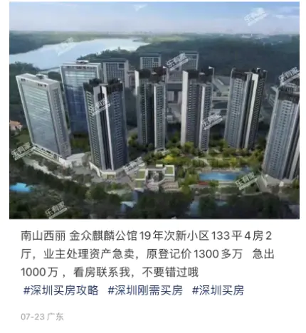 2019年开盘、2021年交房的西丽红盘,建面约138㎡的楼王单位,只卖1000万,比原登记价便宜近300万,更有业内人士分析,买家捡漏500万,业主直亏500万。